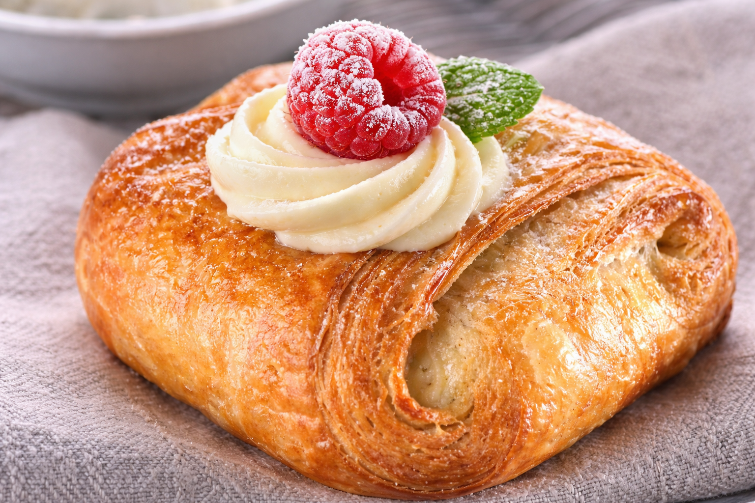 Quarktasche Royal – nach dem Backen mit Cream Cheese Füllung einen Tupfen aufspritzen und eine Himbeere aufsetzen, danach mit Dekorschnee leicht abpudern.